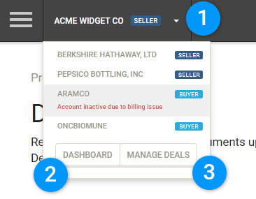 A user account can be attached to multiple businesses with different roles. The Deal Switcher tool is located at the top of the page and will let the user choose between deals. From here, the user may also access the Deal Agnostic Dashboard or the Manage Deals section.